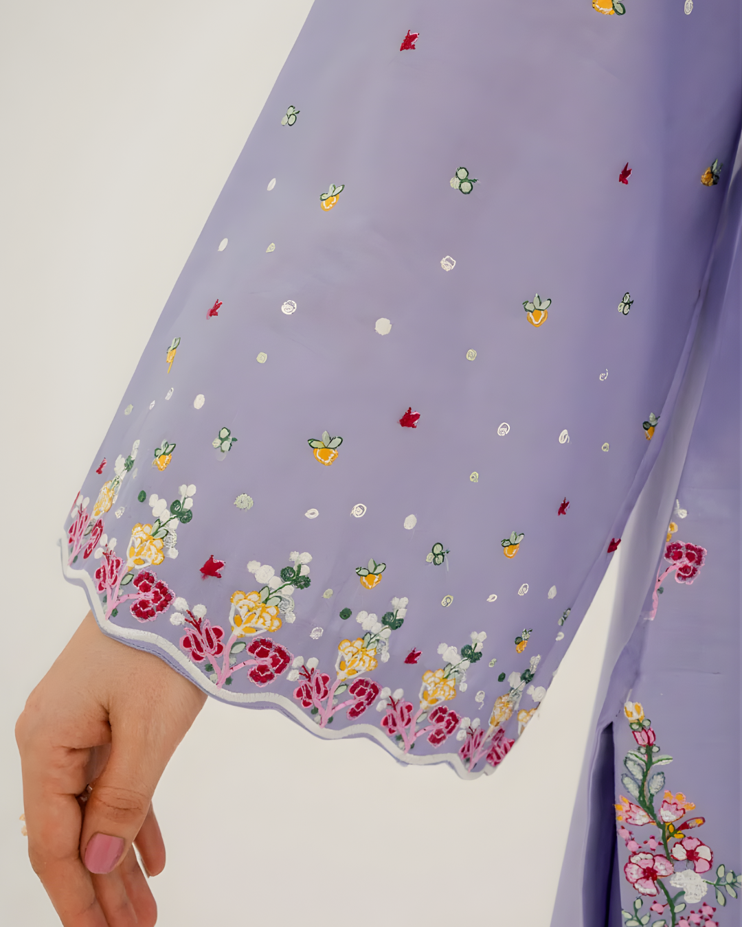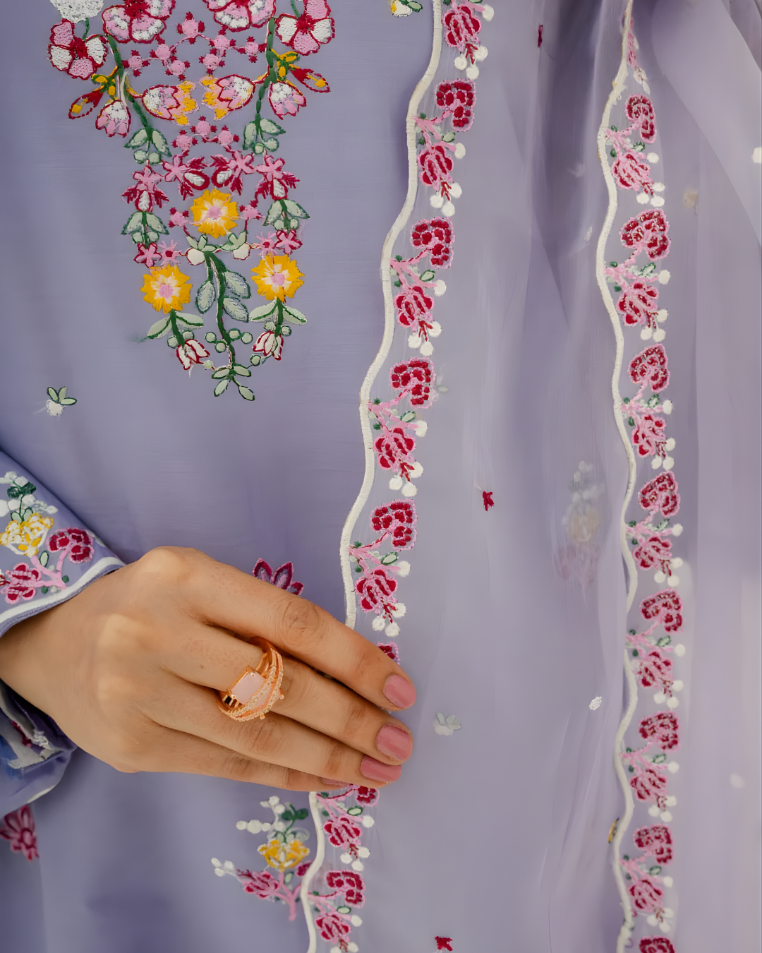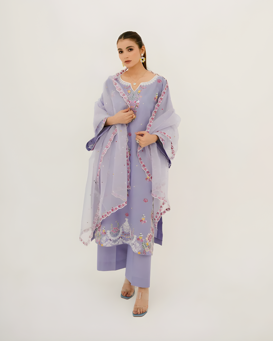 A dreamy pastel ensemble featuring a light purple lawn shirt beautifully detailed with floral embroidery on the neckline, sleeves, and hem. Paired with soft cambric trousers and a sheer organza dupatta finished with intricate embroidery on all four sides. This look radiates seasonal charm and feminine elegance, making it a perfect choice for Eid and summer festivities.