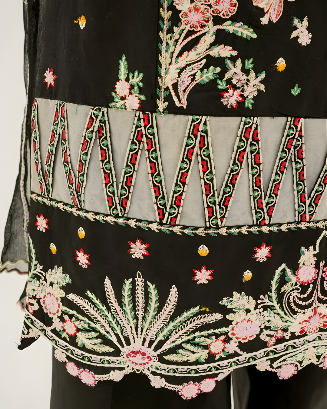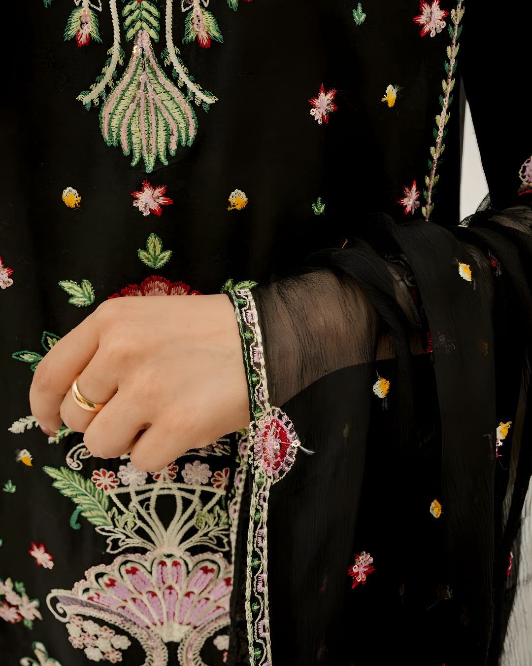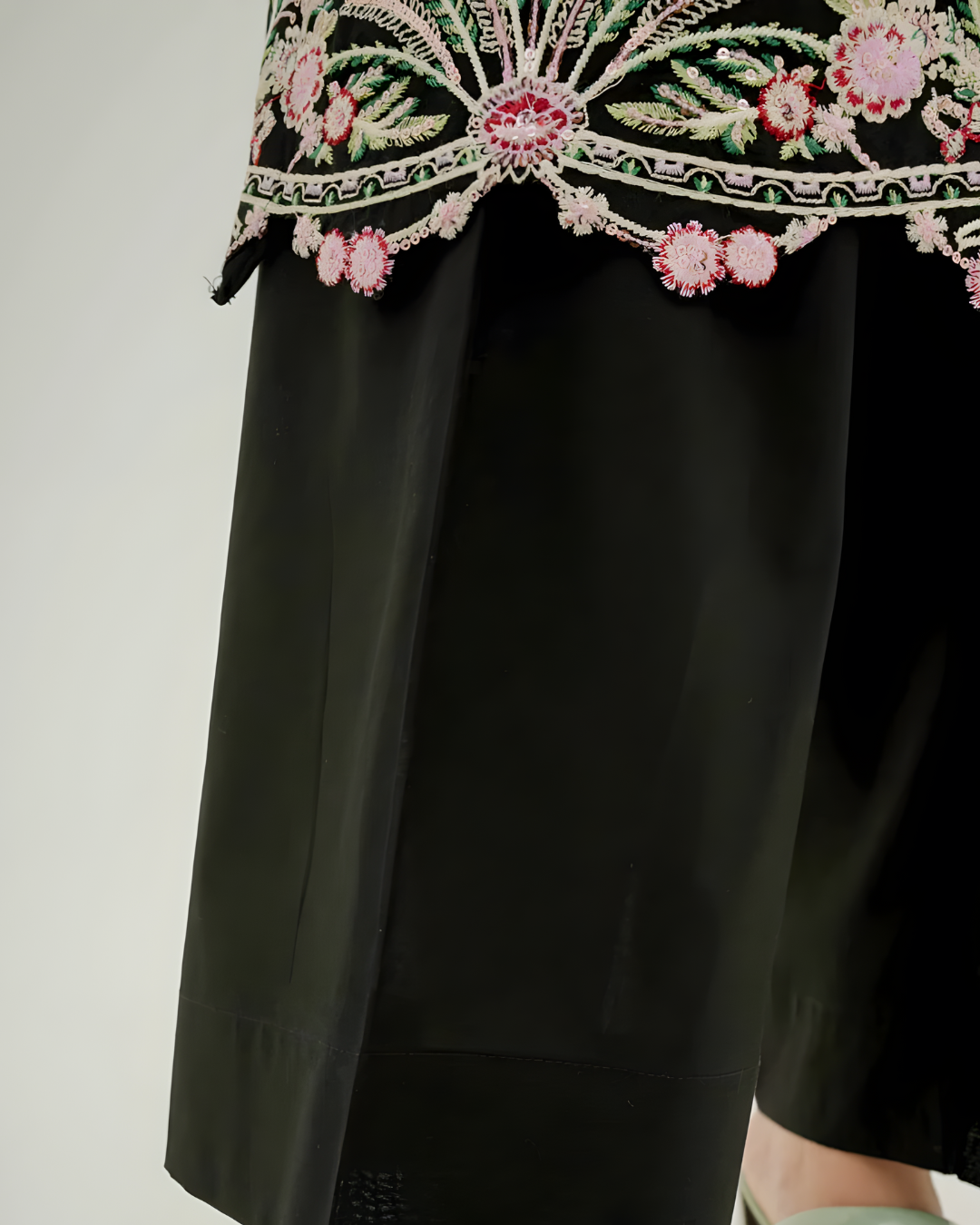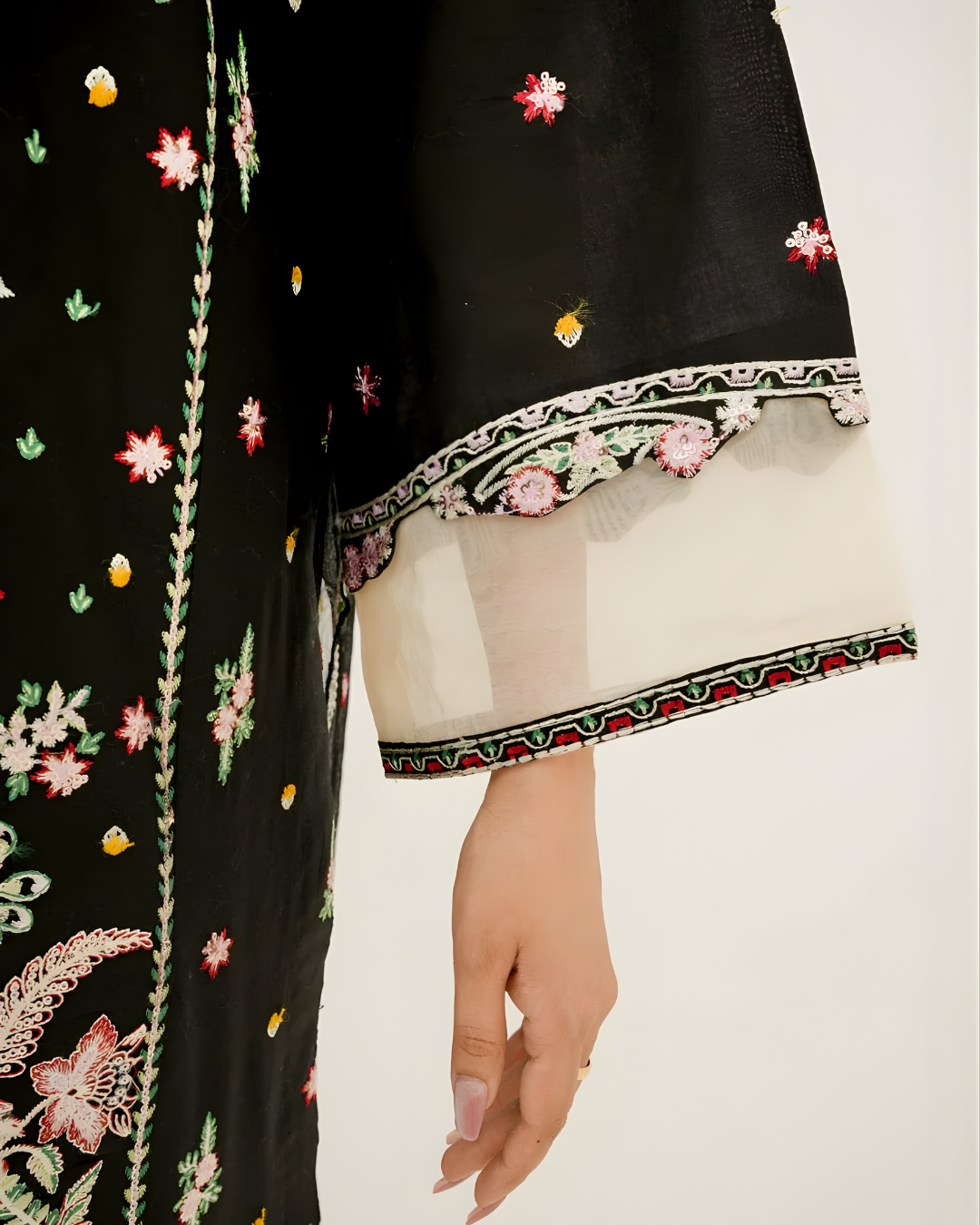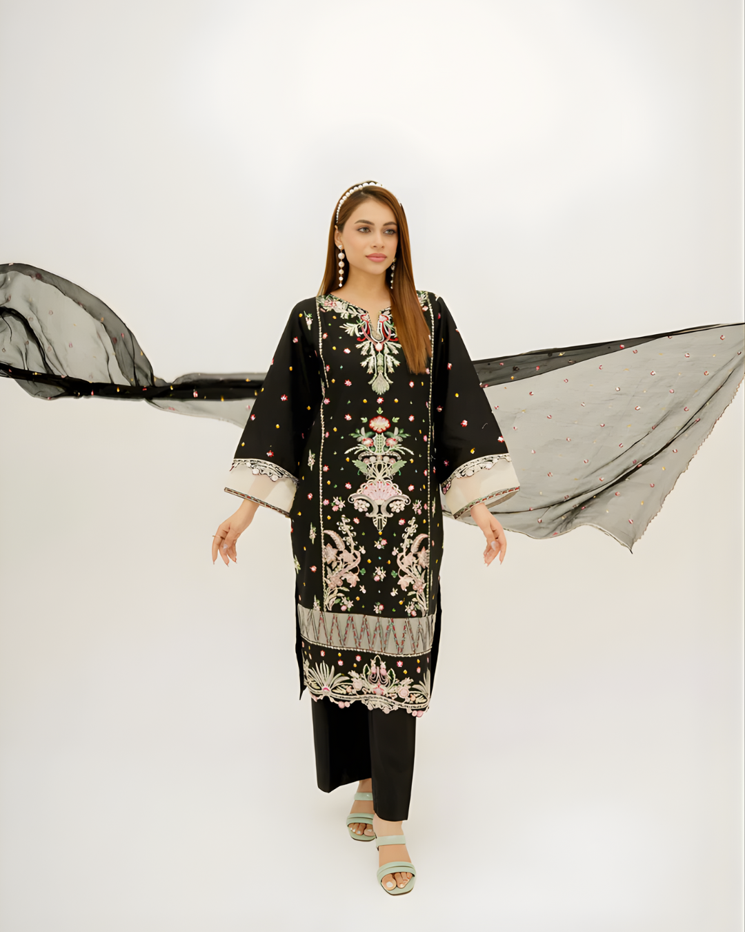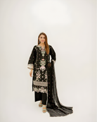 A sophisticated black ensemble featuring a luxury lawn shirt meticulously adorned with full embroidery across the panels, sleeves, and hem. Paired with minimalist plain trousers and a sheer weaved chiffon dupatta finished with lavish embroidered borders. This masterpiece captures the essence of cultural artistry, making it a timeless choice for festive evenings and summer celebrations.